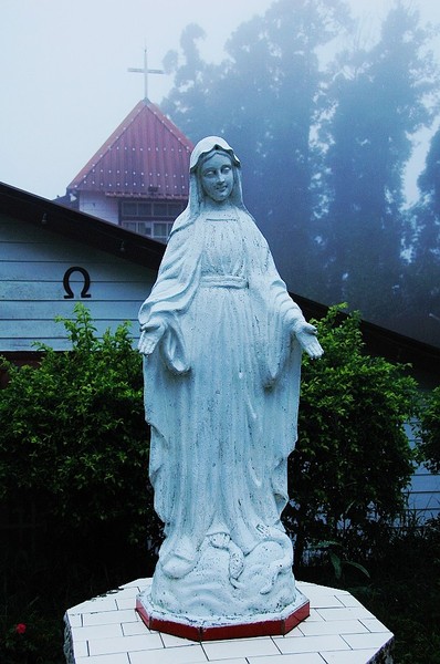即使斷了左手拇指、臉上淌著淚滴似的冰雨,依然在霧中微笑著守護著奮起湖的聖母。