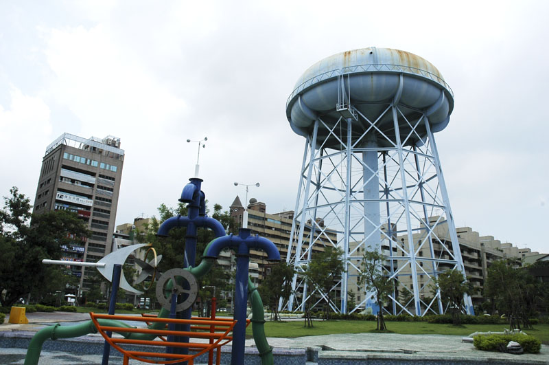 自來水公園本來只是一塊長期被圍起來的空地,空地中央立著一個年代久遠的戰備用水儲水塔,如此而已,不過現在高雄市拼命地在作美化,所以原本畫著無數工業廢棄煙囪前一個有帶著防毒面具的灰暗人影的舊牆,在我跑去外地唸書時不知不覺的被拆掉了,裡面變得鳥語花香;原本生人勿近的戰備水塔城了自來水公園的地標一個聳立在天空,彷彿巨大藍色水母似的大饅頭。啊對,記得我從小就叫它大饅頭。