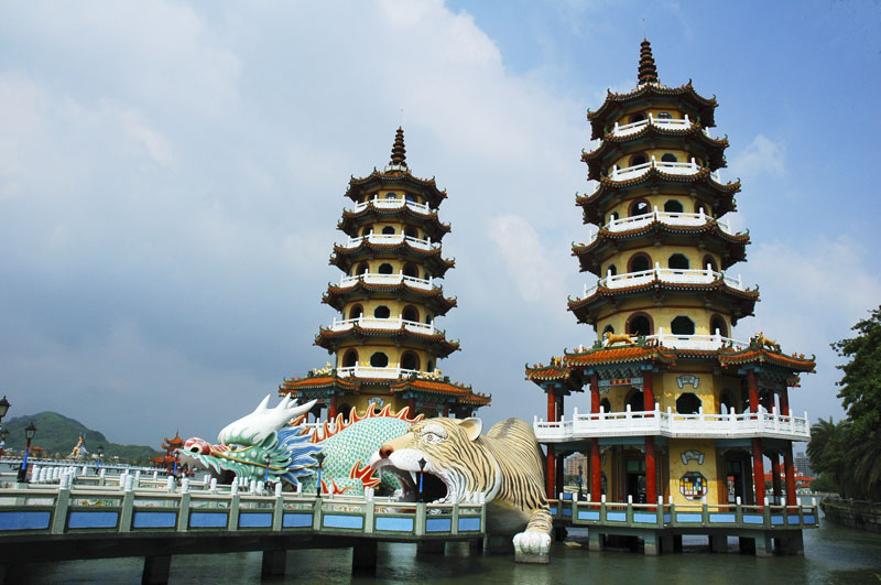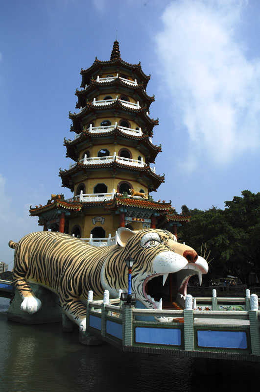 蓮池潭呢,不只是一潭子水,眾所皆知的是潭上還有一對龍虎塔和春秋閣。所謂龍虎塔,就是入口由一龍一虎盤據的一對高塔,要到達高塔,就必須從巨大的龍口中走進龍肚子,然後從龍......龍屁股中出來;由於兩塔相連於潭中,所以要離開則必須從虎屁股進虎身,最後從虎口出去。自小我就聽說到訪者一定要從龍口入虎口出,方能求得好運,如果從虎口入則是不吉利的舉動。印象中我一直是個聽話的好小孩,從來沒有白目地和別人走反方向,這次也不例外。