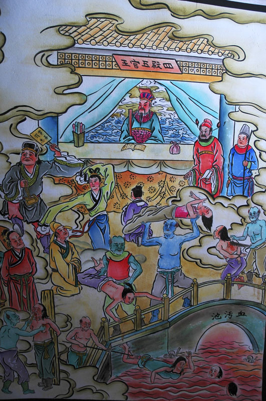 走進龍肚子、虎身軀,不錯的噱頭吧!不過這算什麼,讓我自小就對蓮池潭龍虎塔印象深刻的,是龍肚子裡的牆上畫著的十殿地獄圖;電影《雙瞳》裡有寒冰獄、拔舌獄等等道教中地獄的描述,在十殿地獄圖裡一個都沒少。現在成年了,看這畫著刀山血池斬肢剖腹的壁畫自然不害怕,但是這些壁畫卻著實讓年幼的我又著迷又恐懼呀!每次走入龍口,就不得不在黑暗的水泥甬道(龍肚子)裏看這些地獄圖,所以每次從龍屁股出來的時候都好像剛從地獄門口逃出來般心有餘悸。