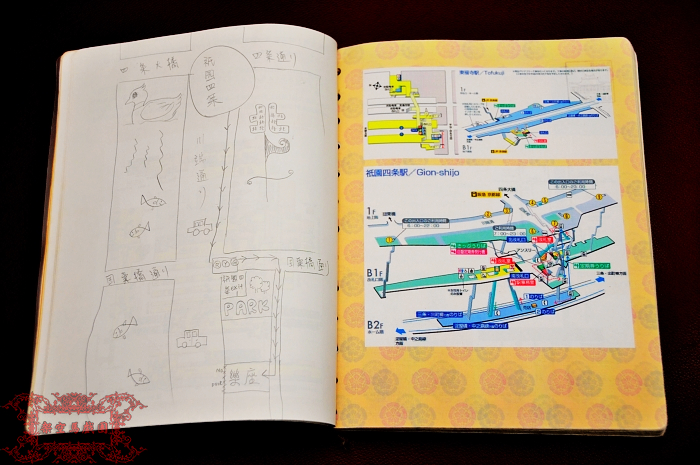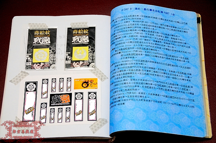 接下來,我在事前已經輸入在Word中的行程表上加了詳細的區域地圖、地鐵站剖面圖、交通時刻表等等輔助資訊,然後以景點作為頁書單位做一些基本的排版和編輯。由於我覺得一般般的空白背景印出來感覺就像學校或公司用的刻板報告,於是找來了我最景仰的戰國大名織田信長公的家徽「織田木瓜紋」圖檔來加工做成背景圖。編輯結束後,我選擇用B5大小(而非比較簡單的A4折半變A5)輸出,因為用A5輸出的話,這本旅遊書的頁數可能會破百;選擇以B5輸出,就能將總頁數(含封面封底)控制在90頁以內XDD