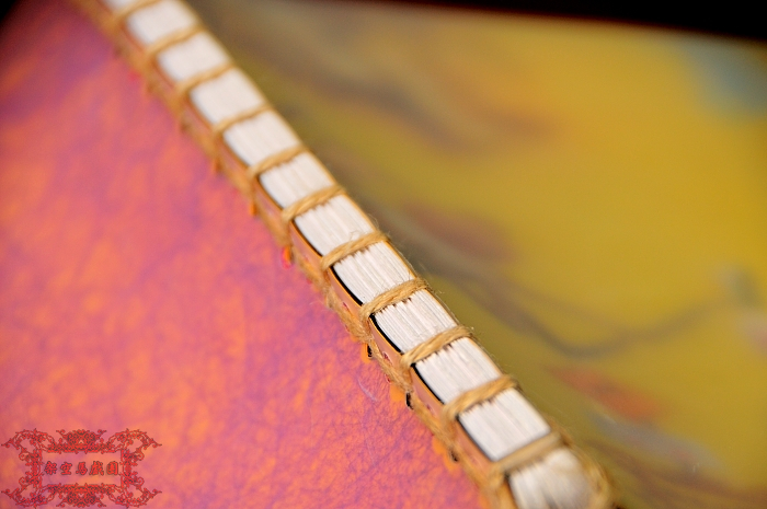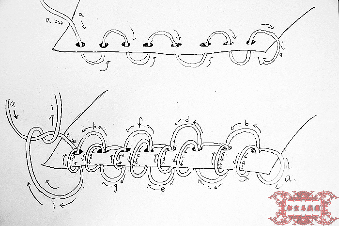 打洞完成、頁數排好、加上封面封底等等所有要裝成一本書的內容物之後,接下來就是令人興奮的線裝啦~~線裝的步驟其實很簡單,裝法也是百無禁忌隨君喜好(反正只要能把書頁固定好就行了),不過這次我選擇的是比較中規中矩的傳統線裝法。有興趣的話可以參考我畫的醜醜教學圖(不好意思只能用畫的,因為用講的反而更難理解)