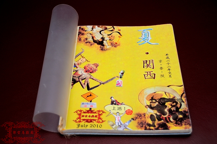 首先,我為這次要走訪的三個城市(京奈阪)各找了幾樣有代表性的名物圖檔,如日本每個小學生都知道的京都建仁寺風神雷神圖、奈良興福寺的美少年阿修羅像、大阪的固力果人等等,將之全部用photoshop貼在一起做成(充滿歡樂惡趣味)的封面,然後到文具行挑了幾張藝術紙用來當封底和美觀用的夾頁,以及一個B5大小的活頁夾鏈袋好來收納一時來不及整理的票根等小東西;最後,我順便將已經不用的舊筆記本的透明硬封面(可以防塵防沾水)拆下來廢物利用,準備放在封面和封底的最外層。
