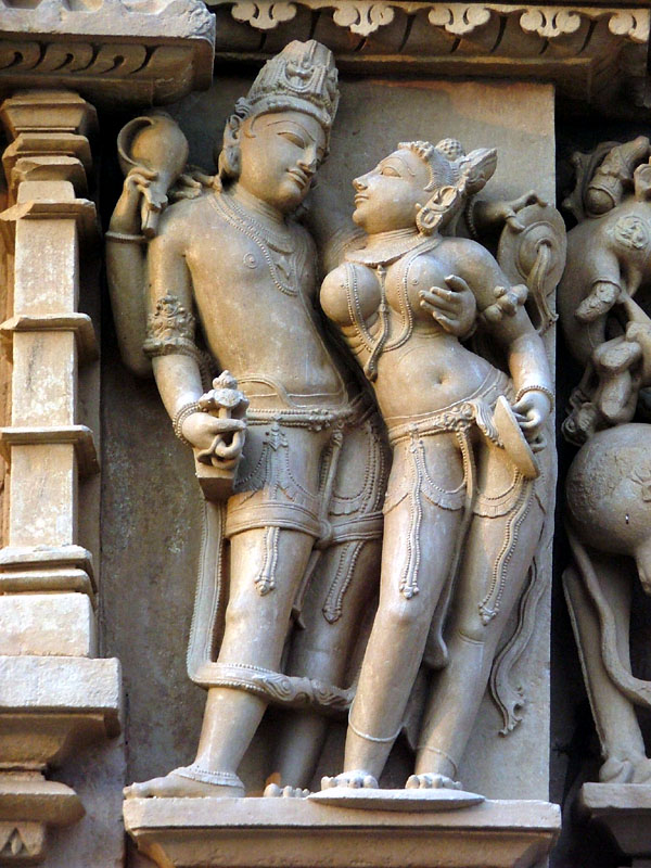 這是世界遺產卡鳩拉荷(Khajuraho、俗稱印度性愛神廟)東神廟群中的一對神像雕刻,上頭的兩位神明是目前最受廣大印度教徒信仰愛戴的Vishnu and Lakṣmī (毗濕奴大神和神妃拉克絲米)。回想我第一次看到這對神像的時間點,嗯,應該是國小時期翻老媽買的《世界遺跡大觀》的時候吧。相較於各式各樣活躍於台灣的宗教裡那些莊嚴威武神聖不可侵犯的神明們,照片中的溫柔可親Vishnu and Lakṣmī則以深情款款的眼神凝視彼此,嘴上還帶著幸福的淺淺微笑,整個畫面美到讓還不懂得男歡女愛為何物的那個年幼的我第一眼看到就驚艷不已、一見鍾情!我想我對印度古文明的鍾愛,應該就始於書中介紹這對雕像的那一張照片吧。