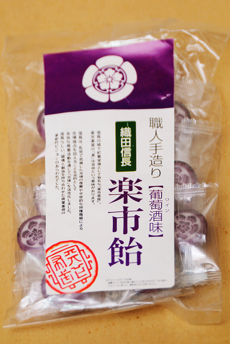 糖果的「楽市」之名,來自信長公頒布的「楽市・楽座」經濟政策。所謂的楽市楽座,簡言之就是工商交易自由化的政策。大家都知道日本自古以來就是個相對封建、保守、缺乏社會流動的社會,然而在如此封閉的社會風氣之中,信長公卻大刀闊斧地開放通商,明訂只要繳交一定費用,任何人都能自由地交易買賣。在楽市・楽座政策之下,商業活動不但受到領主的保障,更有減稅與自由通關的好處。多虧了這個大幅超越當代思想的政策所帶來的繁榮商業與良性競爭,信長公的國土尾張才能迅速國富兵強,從一個小不啦嘰國穩定發展成織田信長公統一全日本的根據地。