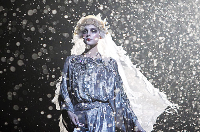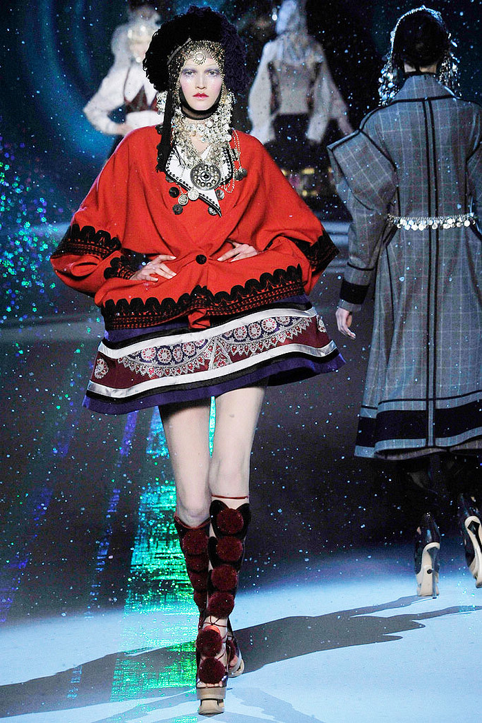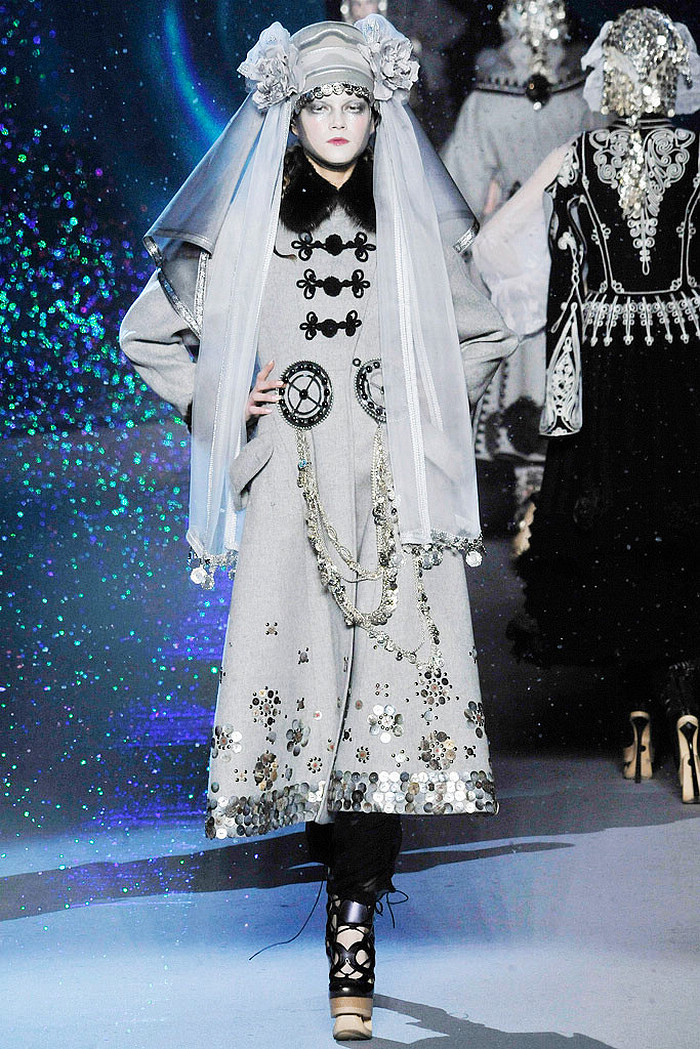 從主題、配色、飾品與妝容(尤其是以珠光銀眼影打在臉上的淚痕)看來,這場秀誠如標題所述,就像一場華麗詭美的波希米亞雪季送葬列。雖然這麼說完全是張飛打岳飛的蘋果橘子馬後炮,但伸展台上的Galliano女孩們看來就像一邊嘆息著天妒英才、一邊振作起最美麗的容姿,送Galliano這位自毀前程的時尚奇葩走完時尚生涯的最後一程啊!說著說著,我的Galliano戒斷症候又開始在全身上下的神經叢間躁動了。噢噢,全能的宙斯啊,請讓Galliano在充分贖罪之後回到我們身邊吧。他雖然犯了罪,但畢竟罪不致死啊,請不要讓他永遠被從時尚工業界抹殺!