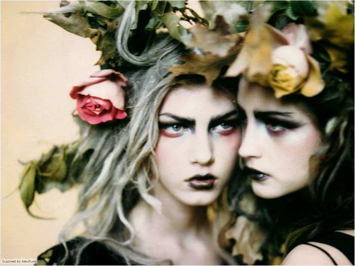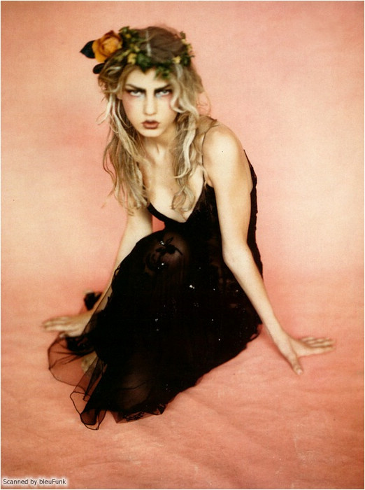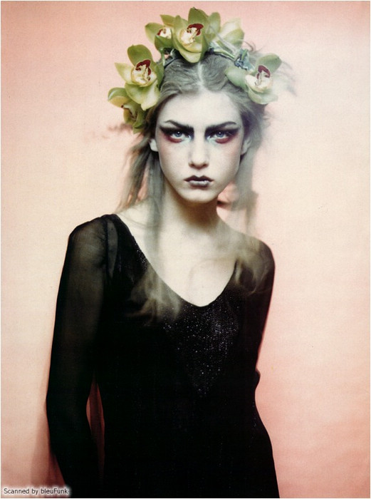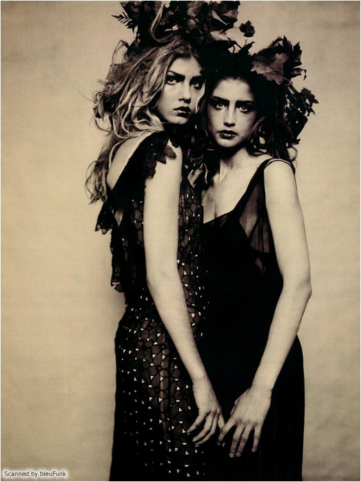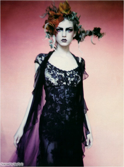 好了,言歸正傳。è nero è romantico這組整整15年前推出的作品以當年正紅到發紫的Angela Lindvall擔任女主角(圖左),甫一推出立刻成為時尚經典,近日甚至還有人拍出了換湯不換藥的「致敬」之作。為什麼突然會想挖出這組作品呢?大概就是因為最近收看All Stars的緣故吧。打從15年前起,我就一直很喜歡Angela這張同時兼具無邪與霸氣的獨特臉蛋;在我的想像中,她應該是個非常高傲、有個性的冰山美人。然而,收看All Stars卻讓我驚艷地發現,比起批評設計師毫不留情的本店主持人Heidi (或許這就是一板一眼的德式性格?),Angela顯然更能以比較婉約的方式說明參賽設計師的作品問題在哪裡。因此,與其說她是高傲的冰山美人,不如說她其實更像個溫柔體貼的鄰家大姊姊呢!在此獻上這組美得讓我當年的14歲少女心噗通亂跳的經典大作,希望各位喜歡!