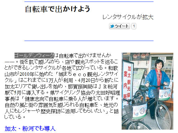講了半天,啾~竟為什麼要那麼執著於區區一台腳踏車呢?因為啊,加太真的是個樸實的小地方,大眾交通工具本來就不發達,而不論是淡嶋神社或友島搭船處,都離加太車站非常遙遠。就算方向感好的我有自信不會迷路,來來回回的還是很吃腳力啊。本來我還忍痛決定要照網路上提供的資訊、砸下三千日幣搭計程車遊加太的呢!(但招不招得到都還是問題)現在,有了這珍貴的腳踏車乙台,我就能在加太暢行無阻了!歐耶!