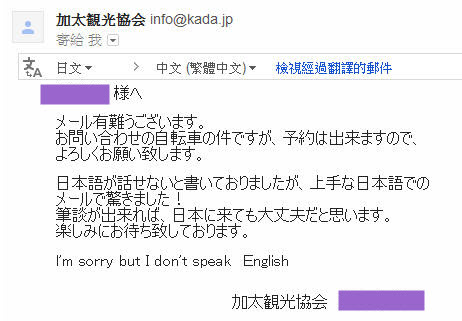 P.P.S. 隔日補充:於是就這樣,我用翻譯網站翻出來的破破爛爛的內容加上自己破破爛爛的日文拼出了一封破破爛爛的日文信,寄給了加太觀光協會。沒想到,今天馬上就收到回信了!以下是回信內容截圖,雖然用這麼爛的日文寫信給日本人實在讓我感到很羞恥,但貌似是預約成功了......吧(?)......耶耶耶~加太我來了~