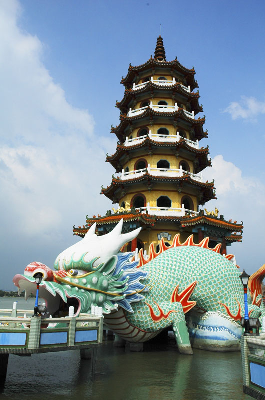 蓮池潭呢,不只是一潭子水,眾所皆知的是潭上還有一對龍虎塔和春秋閣。所謂龍虎塔,就是入口由一龍一虎盤據的一對高塔,要到達高塔,就必須從巨大的龍口中走進龍肚子,然後從龍......龍屁股中出來;由於兩塔相連於潭中,所以要離開則必須從虎屁股進虎身,最後從虎口出去。自小我就聽說到訪者一定要從龍口入虎口出,方能求得好運,如果從虎口入則是不吉利的舉動。印象中我一直是個聽話的好小孩,從來沒有白目地和別人走反方向,這次也不例外。