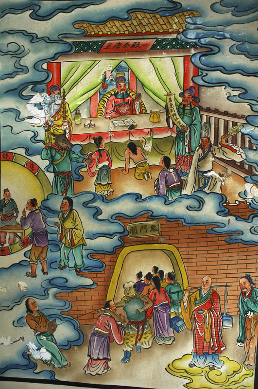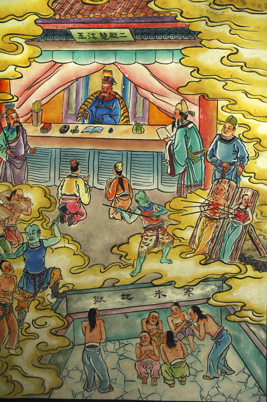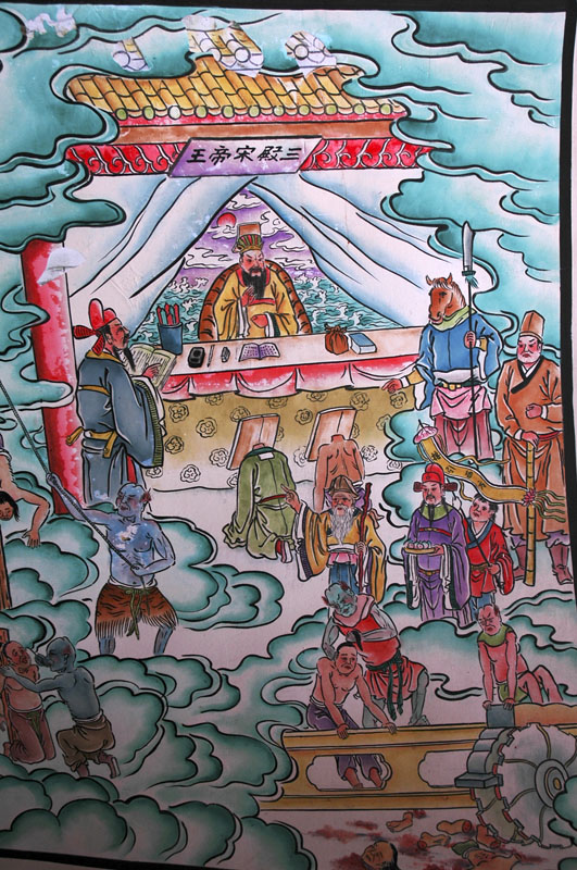 走進龍肚子、虎身軀,不錯的噱頭吧!不過這算什麼,讓我自小就對蓮池潭龍虎塔印象深刻的,是龍肚子裡的牆上畫著的十殿地獄圖;電影《雙瞳》裡有寒冰獄、拔舌獄等等道教中地獄的描述,在十殿地獄圖裡一個都沒少。現在成年了,看這畫著刀山血池斬肢剖腹的壁畫自然不害怕,但是這些壁畫卻著實讓年幼的我又著迷又恐懼呀!每次走入龍口,就不得不在黑暗的水泥甬道(龍肚子)裏看這些地獄圖,所以每次從龍屁股出來的時候都好像剛從地獄門口逃出來般心有餘悸。